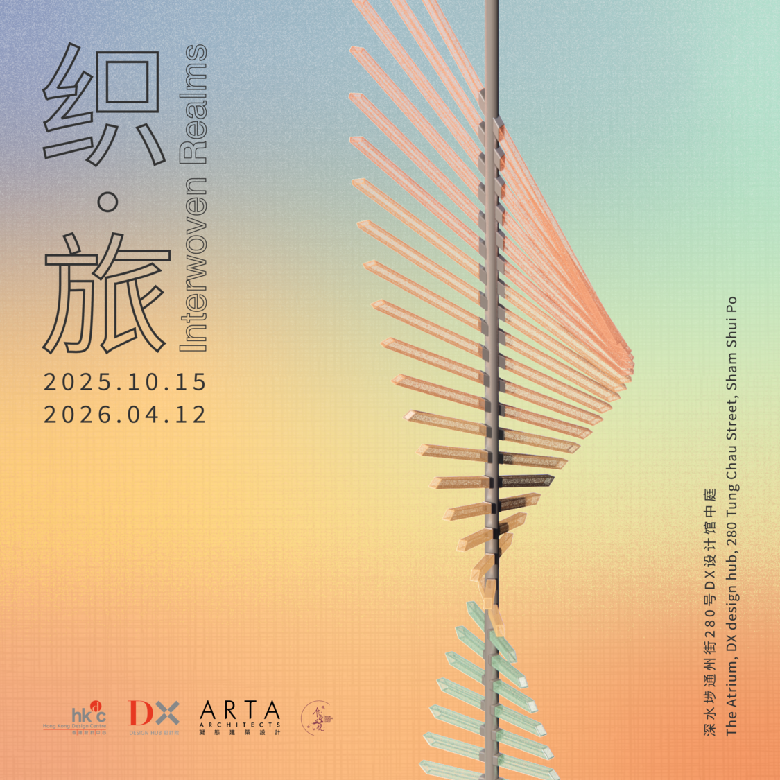 《织‧旅》是一件动态艺术装置,其形态寓意设计是一场无止境的旅程。灵感源自大自然的山川景致、四时的色彩变化、人之比例,以及光与影之间的虚实交错。作品取材于布料的流动曲线与渐变色泽,呼应深水埗昔日纺织市场的历史脉络,编织出属于DX设计馆与此地的共同故事。装置的形态不断变化,随光而动,随境而生,提醒我们:设计如同生命,不断演化。每一步皆是新的开始,每一程蕴含无限可能。